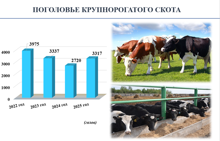Поголовье крупного рогатого скота в сельхозпредприятиях всех форм собственности в 2025 году увеличилось и составило 3317 голов (на 182 головы). В то же время уменьшилось поголовье коров и на 1 января 2026 года составило 1482 голов (на 177 голов). Уменьшение численности коров произошло по причине проведения в округе мероприятий по обновлению стада КРС с целью оздоровления (ликвидация лейкоза).