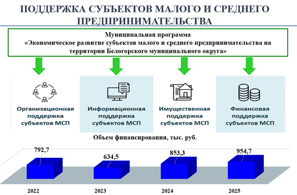 В целях улучшения условий для устойчивого развития малого и среднего предпринимательства в округе разработана и утверждена муниципальная программа «Экономическое развитие субъектов малого и среднего предпринимательства на территории Белогорского муниципального округа», в 2025 была на конкурсный отбор была подана 1 заявка