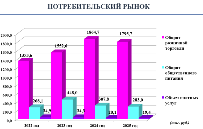 Розничный товарооборот в расчете на душу населения уменьшился на 3,7% и составил 1795,7 тыс. рублей, (в 2024 году – 1 864,7 тыс. рублей).