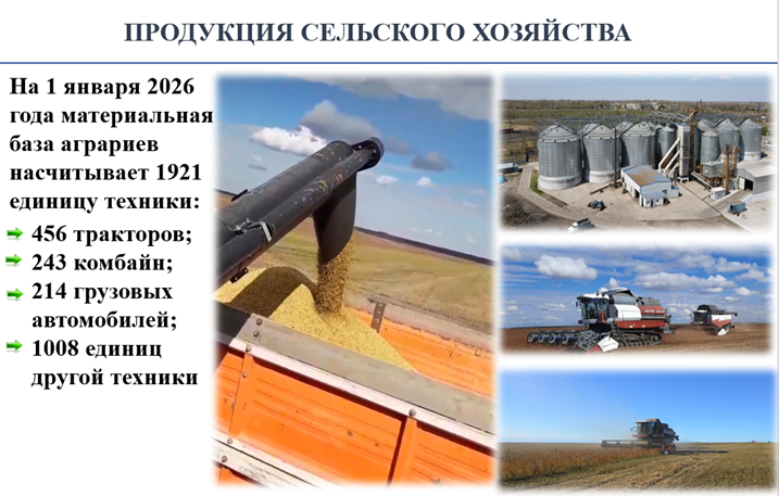 Материально-техническую базу сельхозтоваропроизводителей по состоянию на 01.01.2026 составляют 1921 единица техники: 456 тракторов, 243 комбайна, 214 единиц грузовых автомобилей и 1008 единиц прочей техники. В 2026 году КФХ и сельхозпредприятиями так же планируется приобретение новых тракторов, зерноуборочных комбайнов, сеялок, культиваторов, опрыскивателей и т.д.