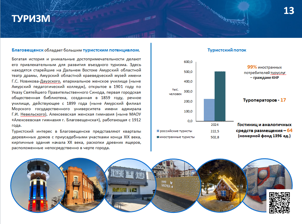 Город Благовещенск имеет благоприятное географическое положение, что создает все предпосылки для развития туризма. Российский город Благовещенск Амурской области и город Хэйхэ провинции Хейлунцзян Китая являются единственной парой городов, расположенной на границе двух государств.