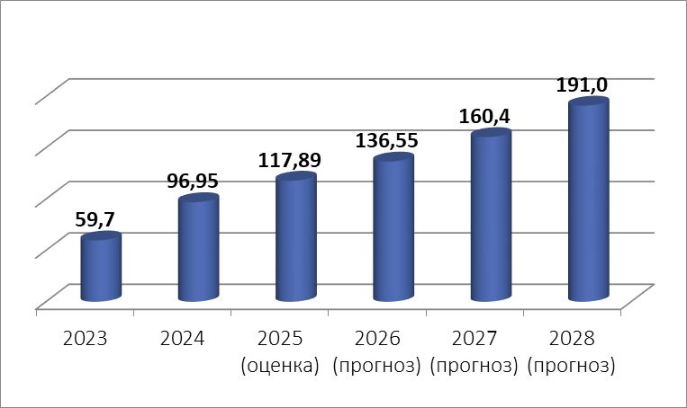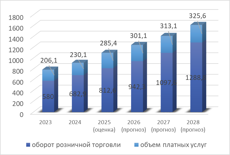Розничная торговля: Оборот в 2025 году составит 812,6 млн руб., что на 14,4% выше уровня 2024 года. Прогнозируется рост до 1288,8 млн руб. к 2028 году.