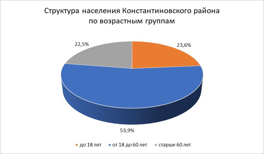 В структуре населения по возрастным группам в 2024 году наибольший удельный вес занимает категория населения от 18 до 60 лет – 53,9% или 5620 человек, до 18 лет – 23,6% (2456 человек), старше 60 лет – 22,5% (2347 человек).