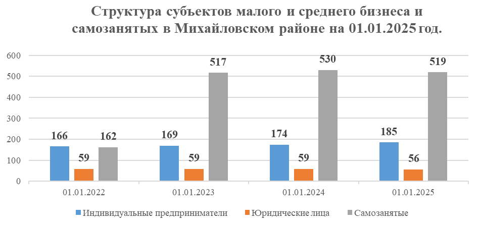По данным Единого реестра субъектов МСП в Михайловском районе. насчитывается 241 субъект предпринимательства. Структура представлена в диаграмме в динамике.