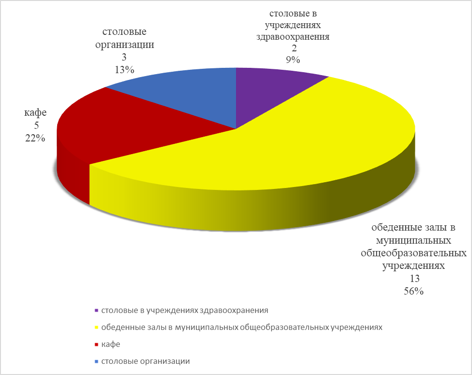 На территории района функционирует 18 предприятий общественного питания, на 1322 посадочных мест (в т.ч. столовые: ЦРБ, тубдиспансера, школьные, для рабочих, кафе). Услуги общественного питания населению оказывают 5 предприятий общественного питания общедоступной сети.