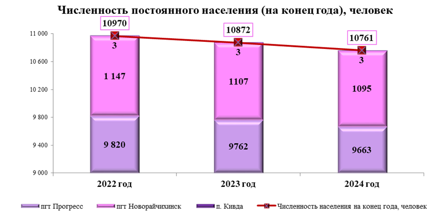 Численность населения рабочего поселка (пгт) Прогресс на 01.01.2025 составила 10 761 человек (среднегодовая численность населения с учетом окончательных итогов ВПН - 10 921 человек).